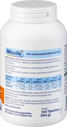Calcium D3 Mivolis là thực phẩm bổ sung đến từ thương hiệu Mivolis – thuộc tập đoàn DM-drogerie Markt nổi tiếng tại Đức. Sản phẩm được sản xuất theo tiêu chuẩn châu Âu nghiêm ngặt, đảm bảo chất lượng và độ an toàn cao.